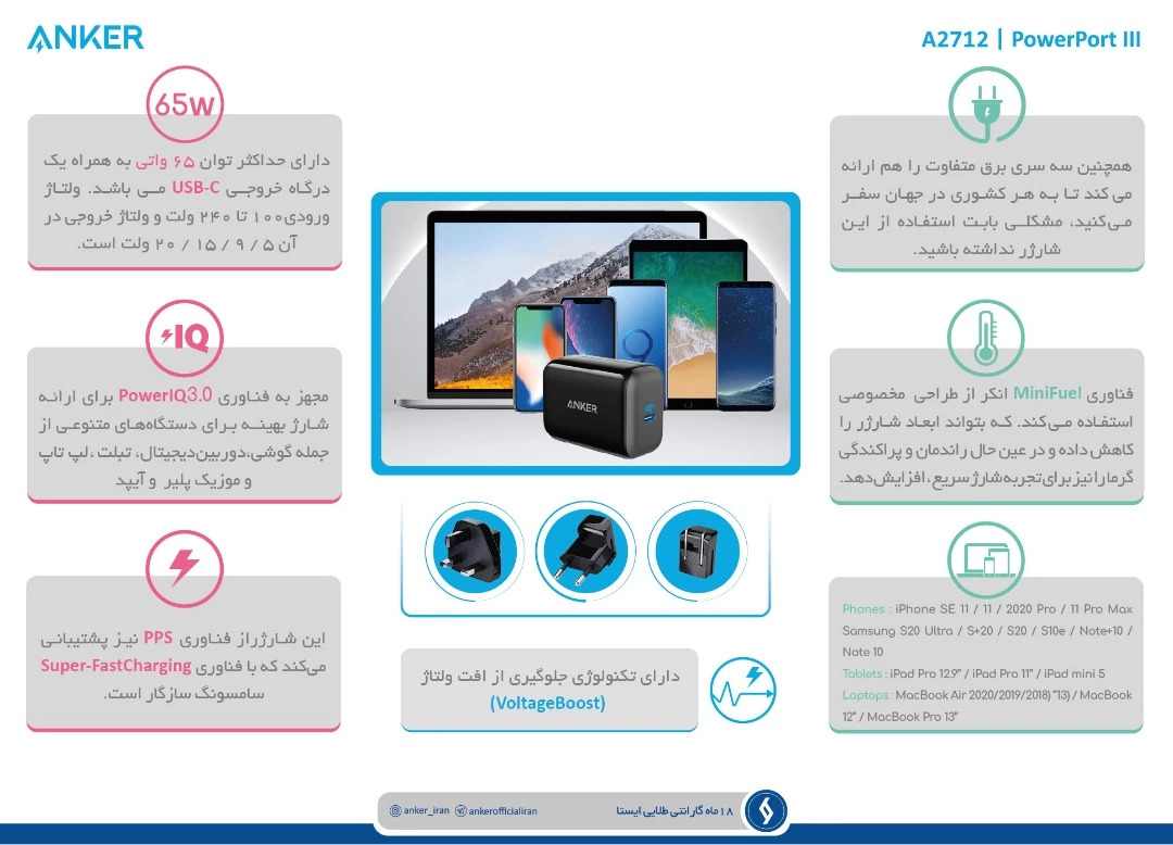 این دستگاه به یک خروجی 65 واتی USB-C مجهز است که فناوری PowerIQ را ارائه می کند. شارژر انکر به لطف این فناوری می تواند شارژ بهینه ای را برای شارژ دستگاه های متنوعی از جمله گوشی، تبلت و لپ تاپ را در اختیار شما بگذارد. علاوه بر این از فناوری PPS پشتیبانی میکندکه با فناوری شارژ Super-Fast Charging سامسونگ سازگار است. همچنین سه سری برق متفاوت را هم ارائه میکند تا به هر کشوری در جهان سفر میکنید، مشکلی بابت استفاده از این شارژر نداشته باشید.