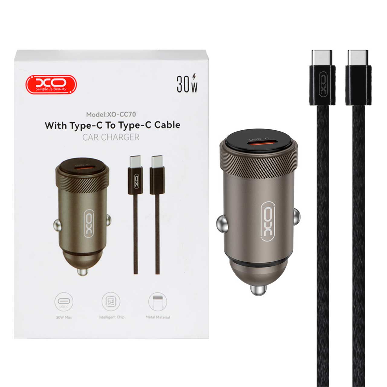 شارژر فندکی فست تک پورت XO مدل CC70 30W به همراه کابل شارژ Type-C To Type-C - قهوه ای تیره